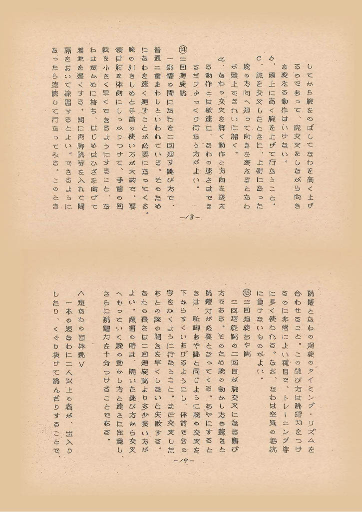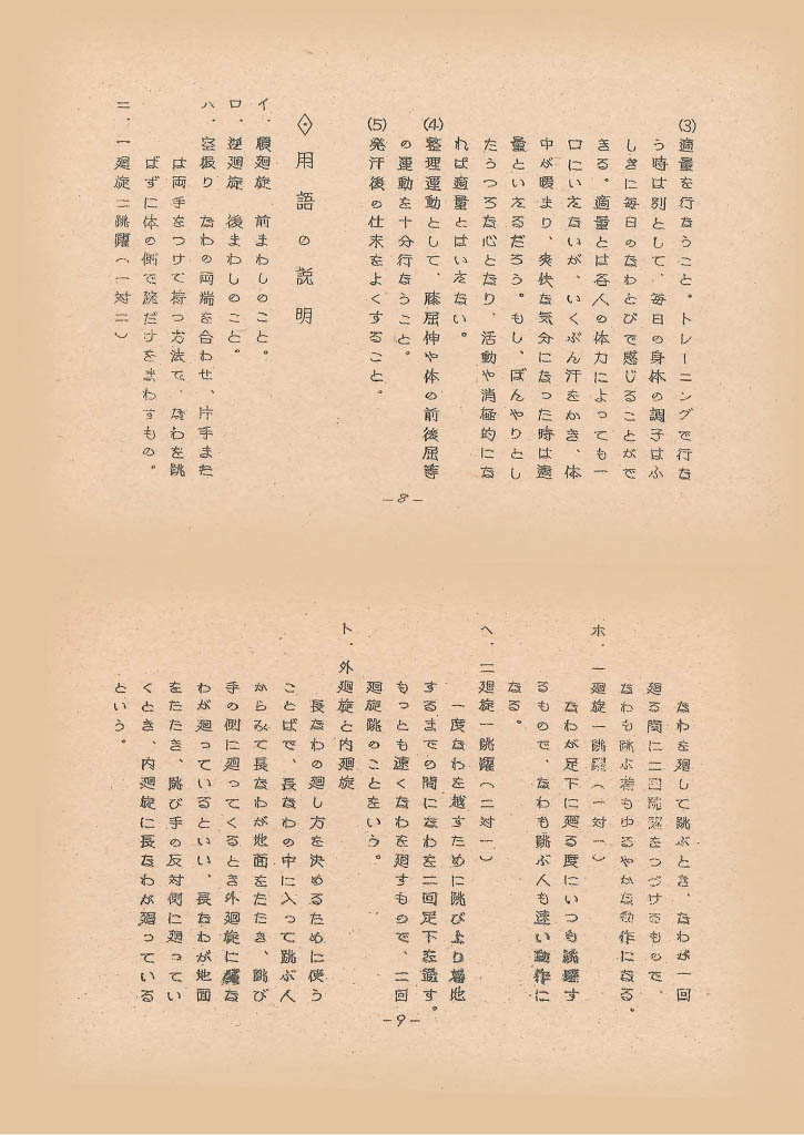 (3)適量を行なうこと。トレーニングで行なう時は別として、毎日の身体の調子はふしぎに毎日のなわとびで感じることができる。適量とは各人の体力によっても一口にいえないが、いくぶん汗をかき、体中が暖まり、爽快な気分になった時は適量といえるだろう。もし、ぼんやりとしたうつろな心となり、活動に消極的になれば適量とはいえない。