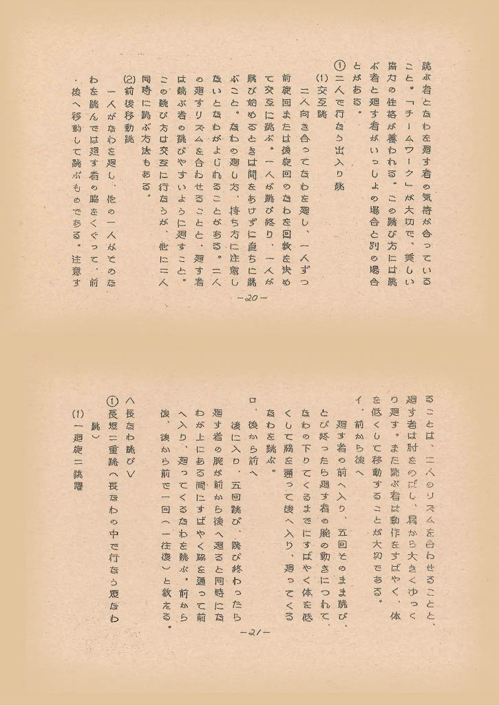 一本の短なわを一人で廻し、一人で跳ぶもので、容易なものから美しく力のいるもの、困難なものまで数多くの種類があるが、主なものをいくつか取り上げてみよう。