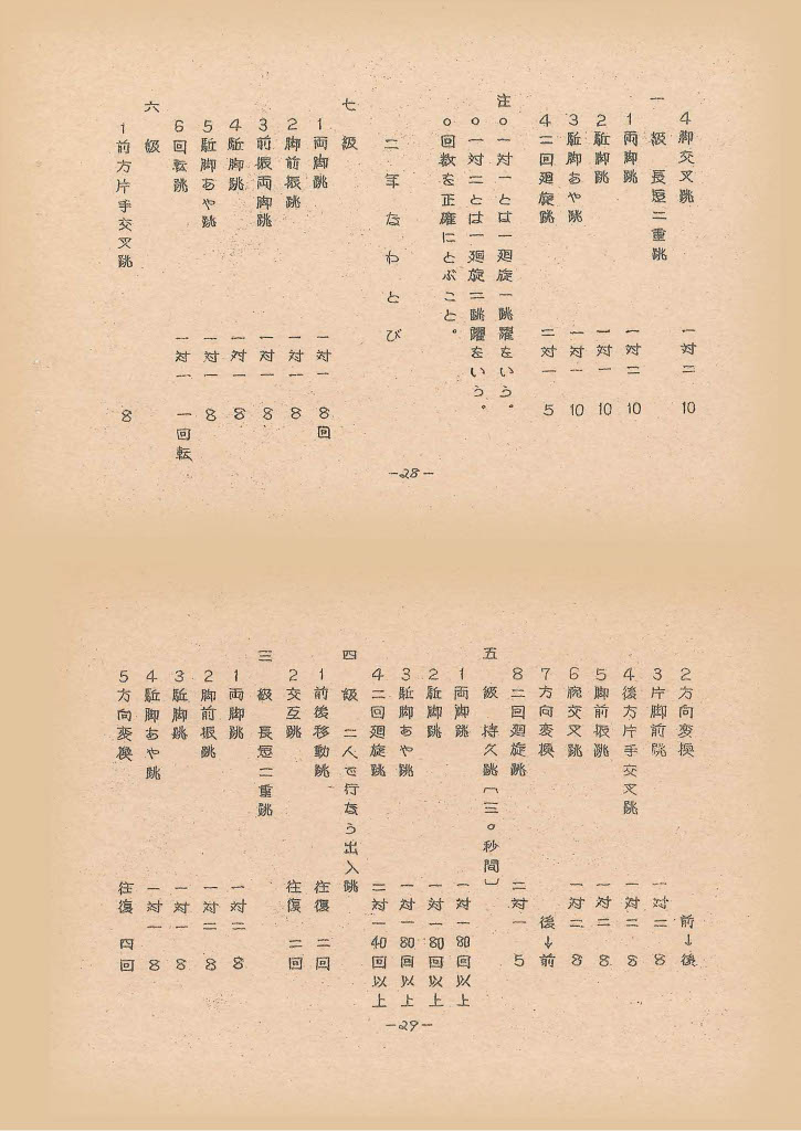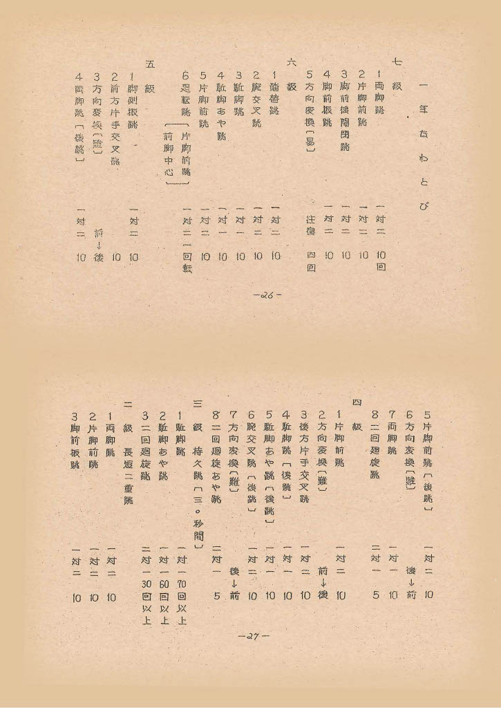 最後に1・2年で行なう級による一連のなわとび運動の種目を列挙して終りとする。