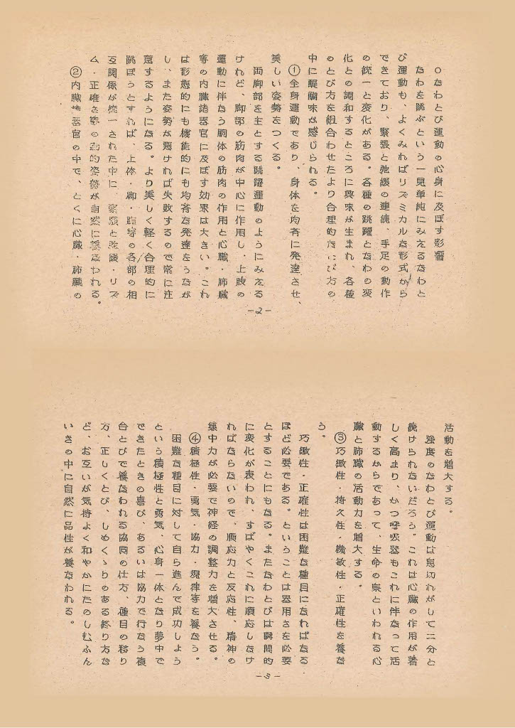両脚部を主とする跳躍運動のようにみえるけれど、脚部の筋肉が中心に作用し、上肢の運動に伴う胴体の筋肉の作用と心臓・肺臓等の内臓諸器官に及ぼす効果は大きい。これは形態的にも機能的にも均斉な発達をうながし、また姿勢が悪ければしっぱいするので常に注意するようになる。より美しく軽く合理的に跳ぼうとすれば、上体・脚・腕等の各部の相互関係が統一された中に、緊張と弛緩・リズム・正確さ等の●的姿勢が自然に養われる。