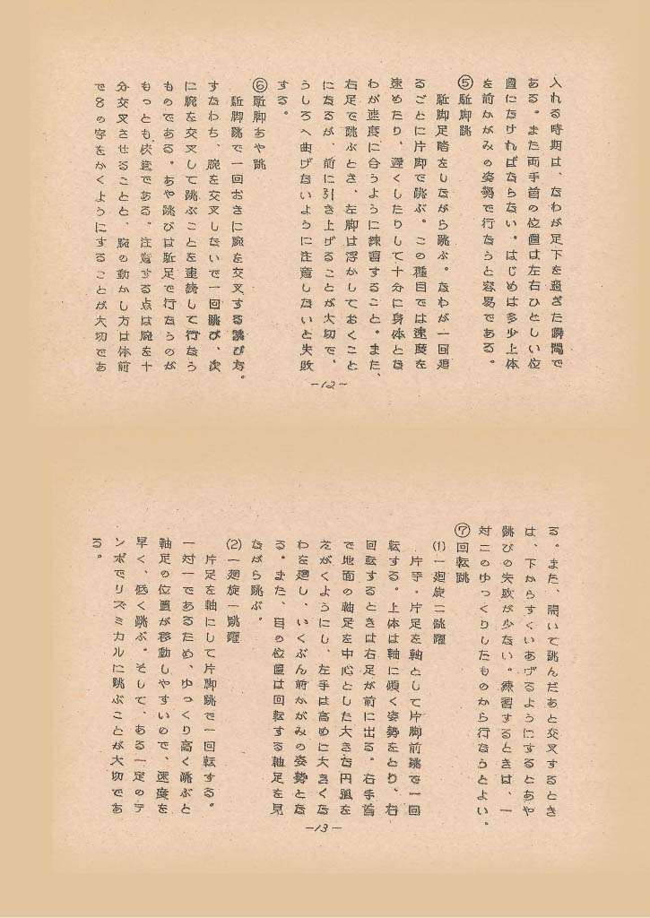 (2)跳躍運動であるから、コンクリートのように頭にひびく固い場所はよくない。運動靴で行ない、砂利等の無い地面で行うこと。