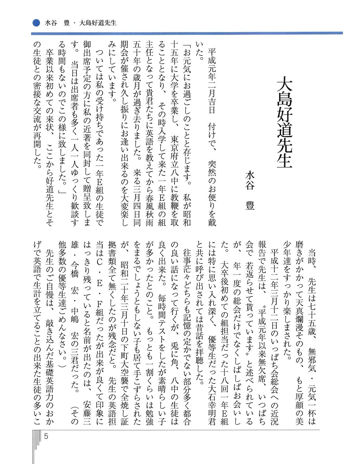 - 「目次 01」の「大島好道 先生:水谷 豊」 大島先生は、大卒後、初担当クラスだった「中18回 1年E組」への思い入れがことのほか強かった、とのことです。(下のボタンを押すと全文が表示されます)