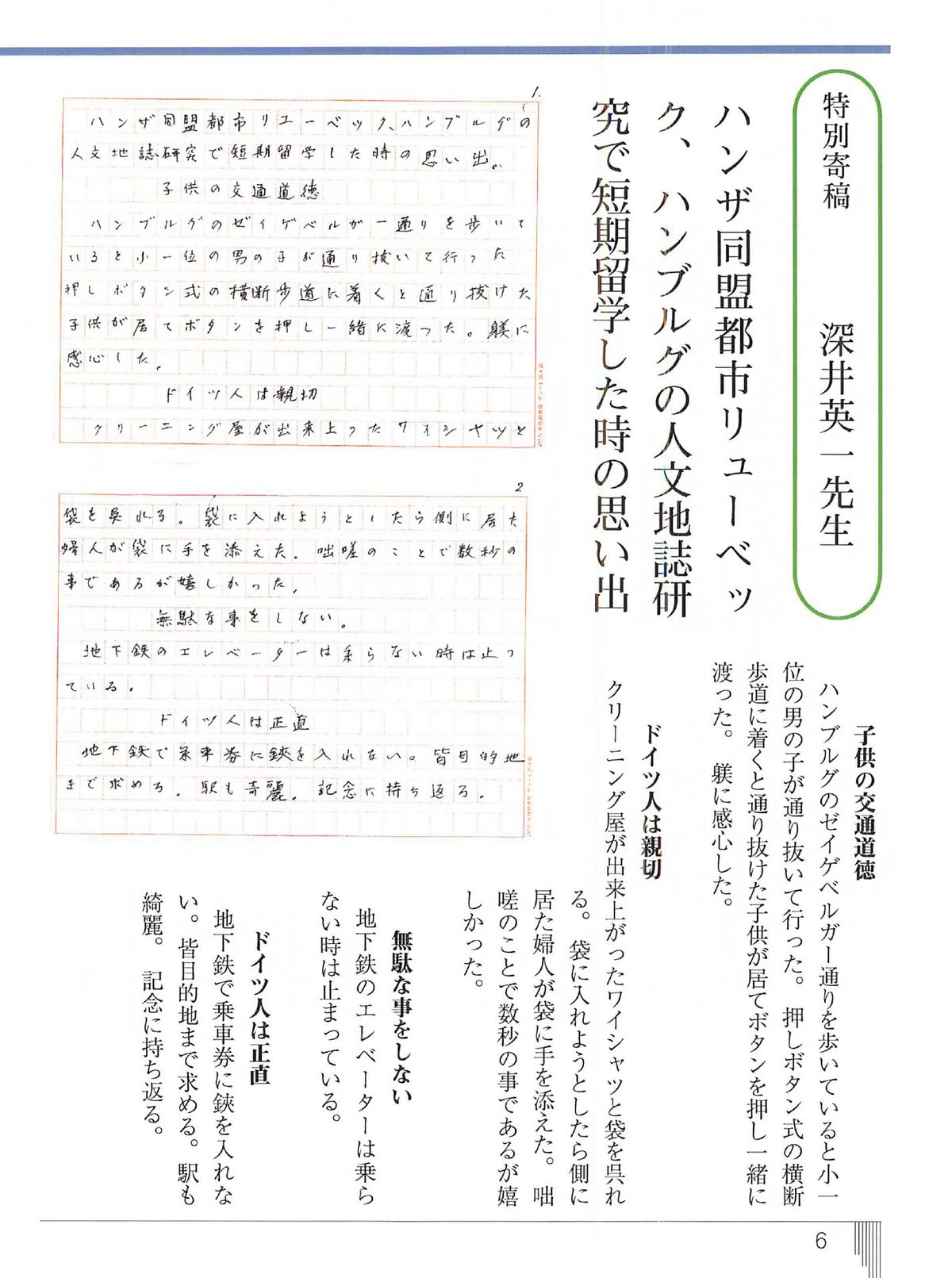 - 「目次 01」で紹介の、発刊当時「100歳」になられた「深井英一先生」からの特別寄稿「ハンザ同盟都市リューベック、ハンブルクの人文地誌研究で短期留学した時の思い出」(下のボタンを押すと全文が表示されます)