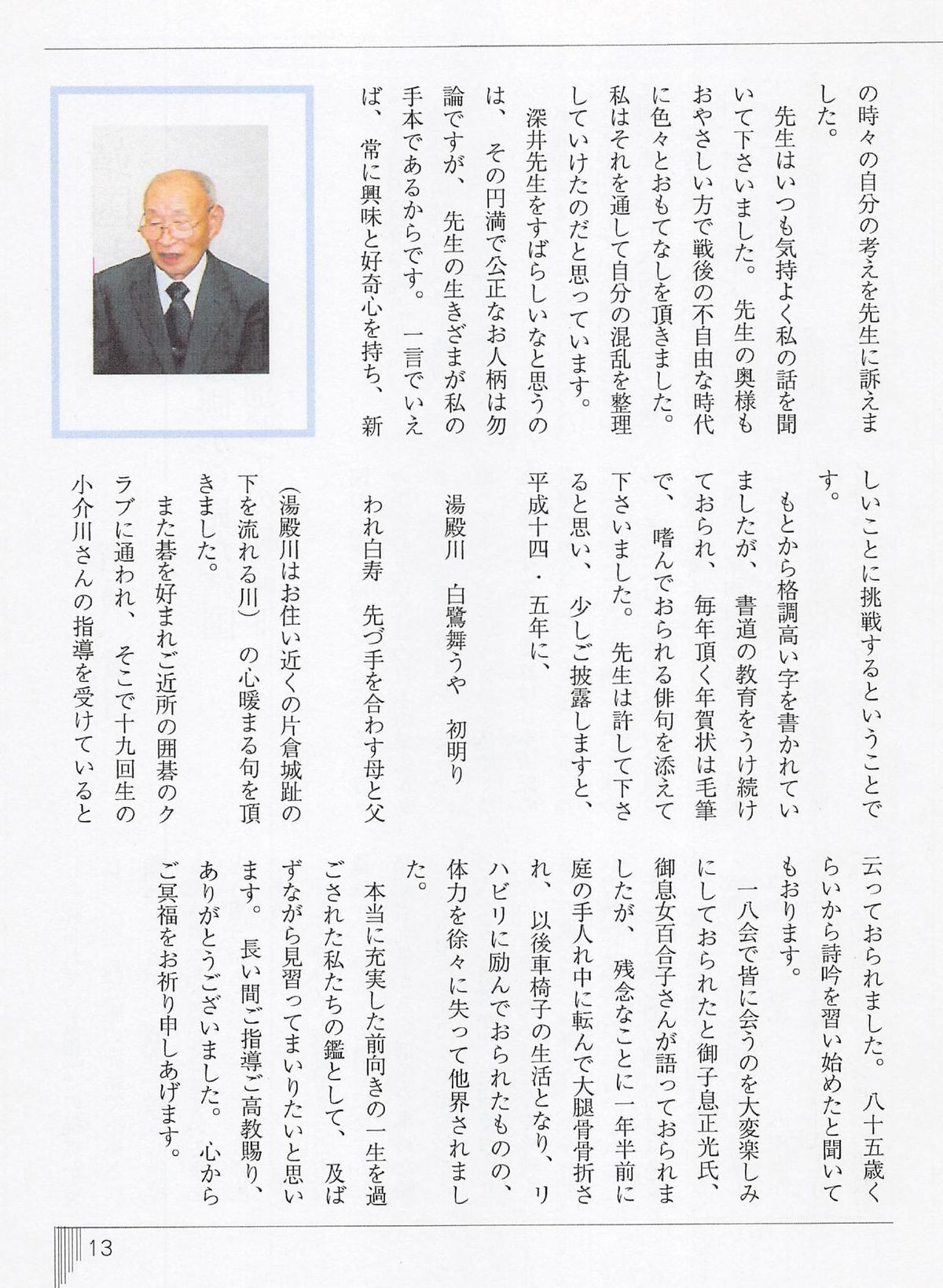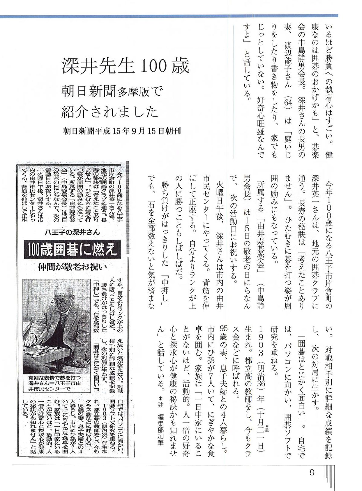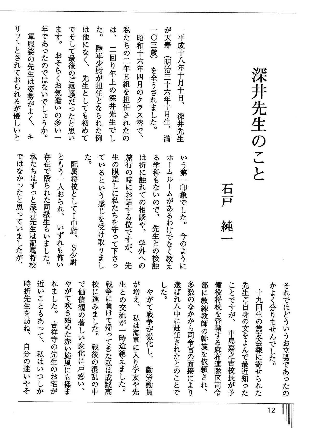 - 「いっぱち 第2号」発刊時に「100歳で特別寄稿」いただいた「深井英一先生」の訃報を受け掲載された「深井先生のこと:石戸純一」(下のボタンを押すと全文が表示されます)