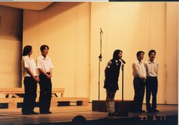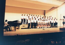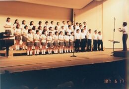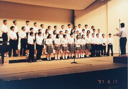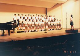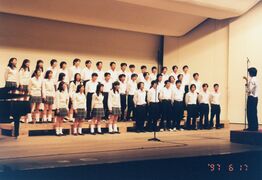 - 上記の目的により昭和45年に始まった合唱コンクールは初めの頃は予選、本選に分けて行われていました。本選に出場できるのは各学年3クラスのみで学年の枠を取り払っての審査のため常に3年生が1,2,3位を独占するという状態だったようです。昭和51年からは会場も学校の講堂から大田区民会館に移ったのを機に全学年が一堂に会し、まる一日かけての開催となりました。更に昭和53年からは審査を学年単位に順位をつけ表彰する形に変わり現在まで踏襲されています。