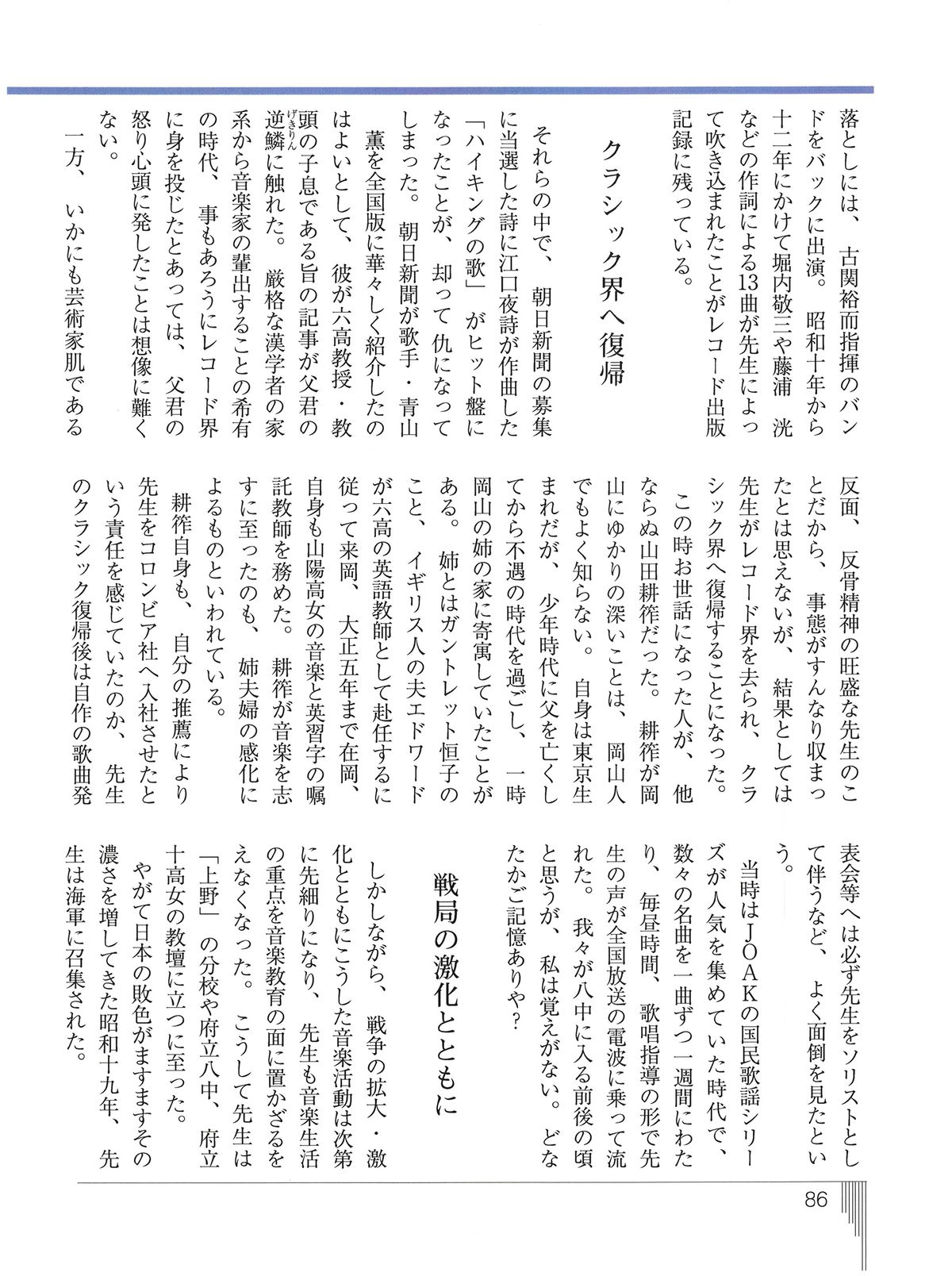 それらの中で、朝日新聞の募集に当選した詩に江口夜詩が作曲した「ハイキングの歌」がヒット盤になったことが、却って仇になってしまった。朝日新聞が歌手・青山薫を全国版に華々しく紹介したのはよいとして、彼が六高教授・教頭の子息である旨の記事が父君の逆鱗に触れた。厳格な漢学者の家系から音楽家の輩出する事の希有の時代、事もあろうにレコード界に身を投じたとあっては、父君の怒り心頭に発したことは想像に難くない。 一方、いかにも芸術家肌である反面、反骨精神の旺盛な先生のことだから、事態がすんなり収まったとは思えないが、結果としては先生がレコード界を去られ、クラシック界へ復帰することになった。 この時お世話になった人が、他ならぬ山田耕筰だった。耕筰が岡山にゆかりの深いことは、岡山人でも良く知らない。自身は東京生まれだが、少年時代に父を亡くしてから不遇の時代を過ごし、一時岡山の姉の家に寄寓していたことがある。姉とはガントレット恒子のこと、イギリス人の夫エドワードが六高の英語教師として赴任しるに従って来岡、大正5年まで在岡、自身も山陽高女の音楽と英習字の嘱託教師を務めた。耕筰が音楽を志すに至ったのも、姉夫婦の感化によるものといわれている。 耕筰自身も、自分の推薦により先生をコロンビア社へ入社させたという責任を感じていたのか、先生のクラシック復帰後は自作の歌曲発表会などへは必ず先生をソリストとして伴うなど、よく面倒を見たという。 当時はJOAKの国民歌謡シリーズが人気を集めていた時代で、数々の名曲を一曲ずる一週間にわたり、毎昼時間、歌唱指導の形で先生の声が全国放送の電波に乗って流れた。我々が八中に入る前後の頃と思うが、私は覚えがない。どなたがご記憶ありや?