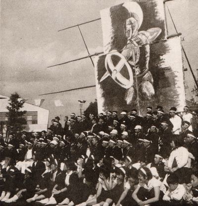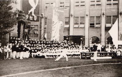 - 1959(昭和34)年10月 応援合戦は青組 (各学年A組とB組計約300人)のものです。