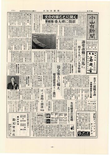 ファイル:1951 昭和26年6月18日 小山台新聞 表紙.jpg|<div style="text-align:center; > 1面上部 </div> | ファイル:1951 昭和26年6月18日 小山台新聞 表紙.jpg|<div style="text-align:center; > 1面上部 </div> | ||